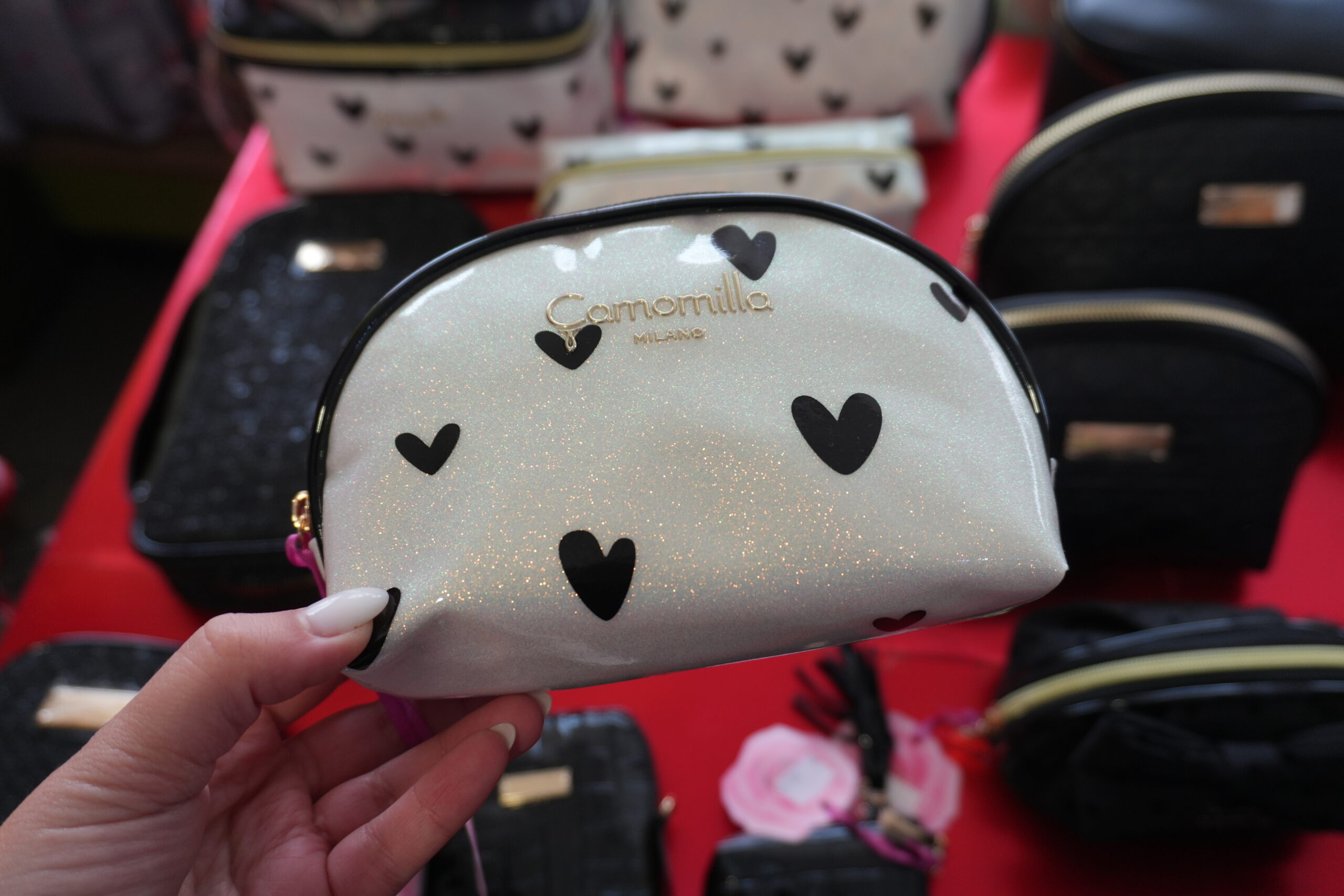Neceser Camomilla Milano con un elegante diseño en tono plateado con efecto brillante y estampado de corazones. Ideal para guardar maquillaje, accesorios o pequeños objetos en tu bolso. Cierre de cremallera resistente y forma práctica para uso diario o viajes.