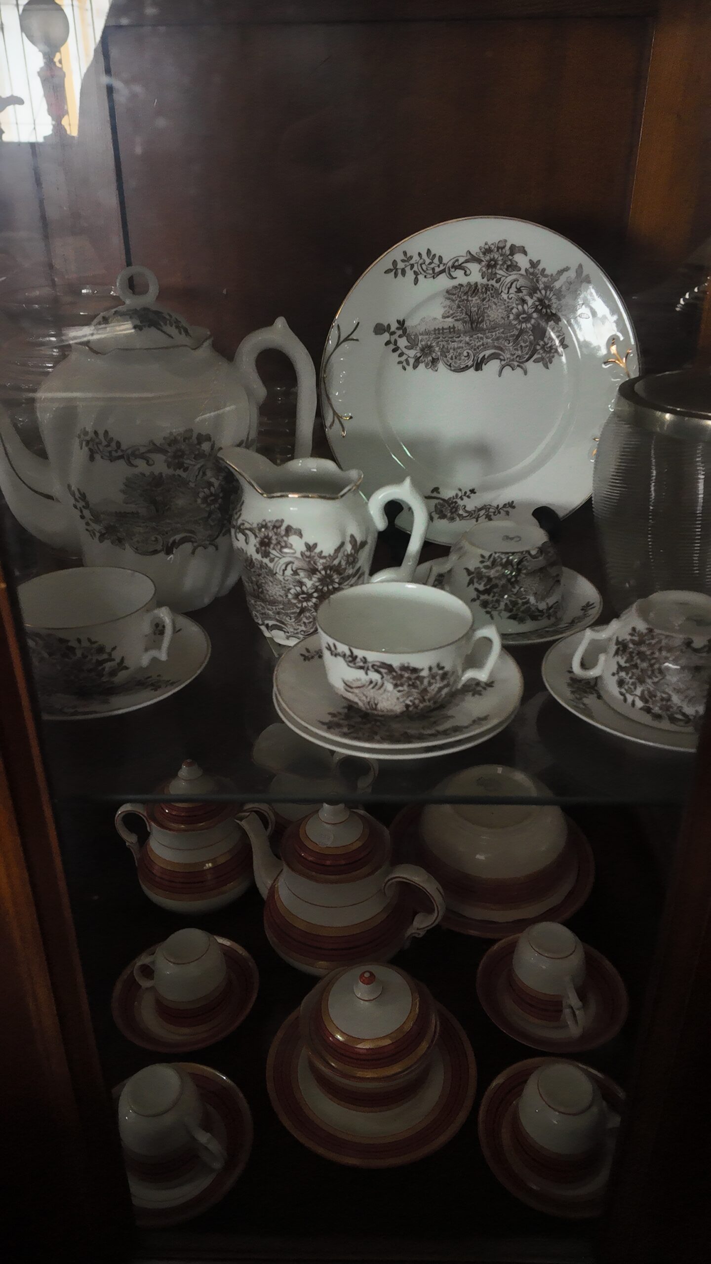 Elegante serviço de chá em loiça com padrão clássico, composto por bule, chávenas, pires e outras peças a combinar. Ideal para servir chá ou café com requinte, sendo também uma excelente peça decorativa para vitrines ou aparadores.